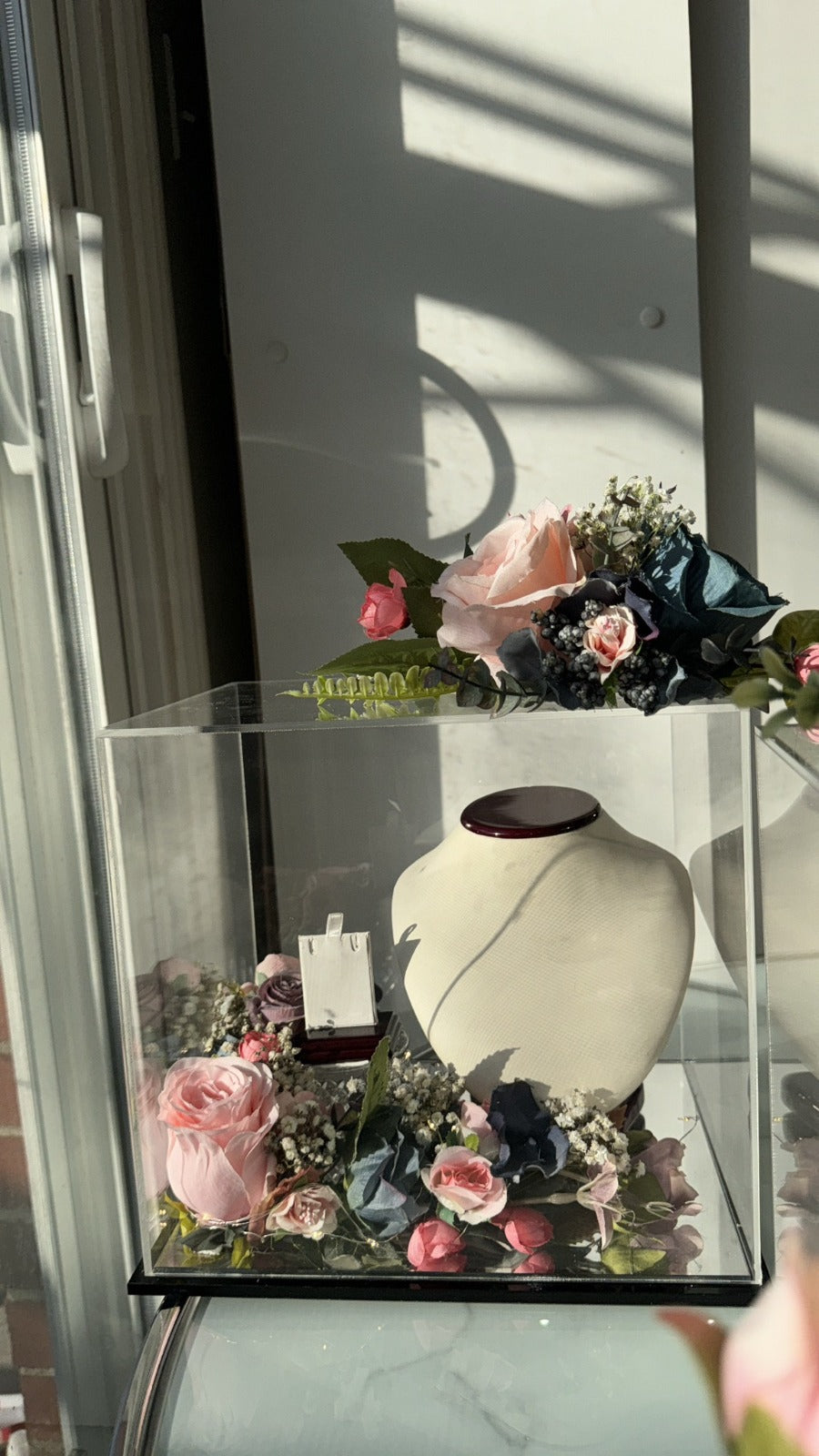 A Necklace Mannequin and an Earring holder with Floral Decoration of your choice cost $130