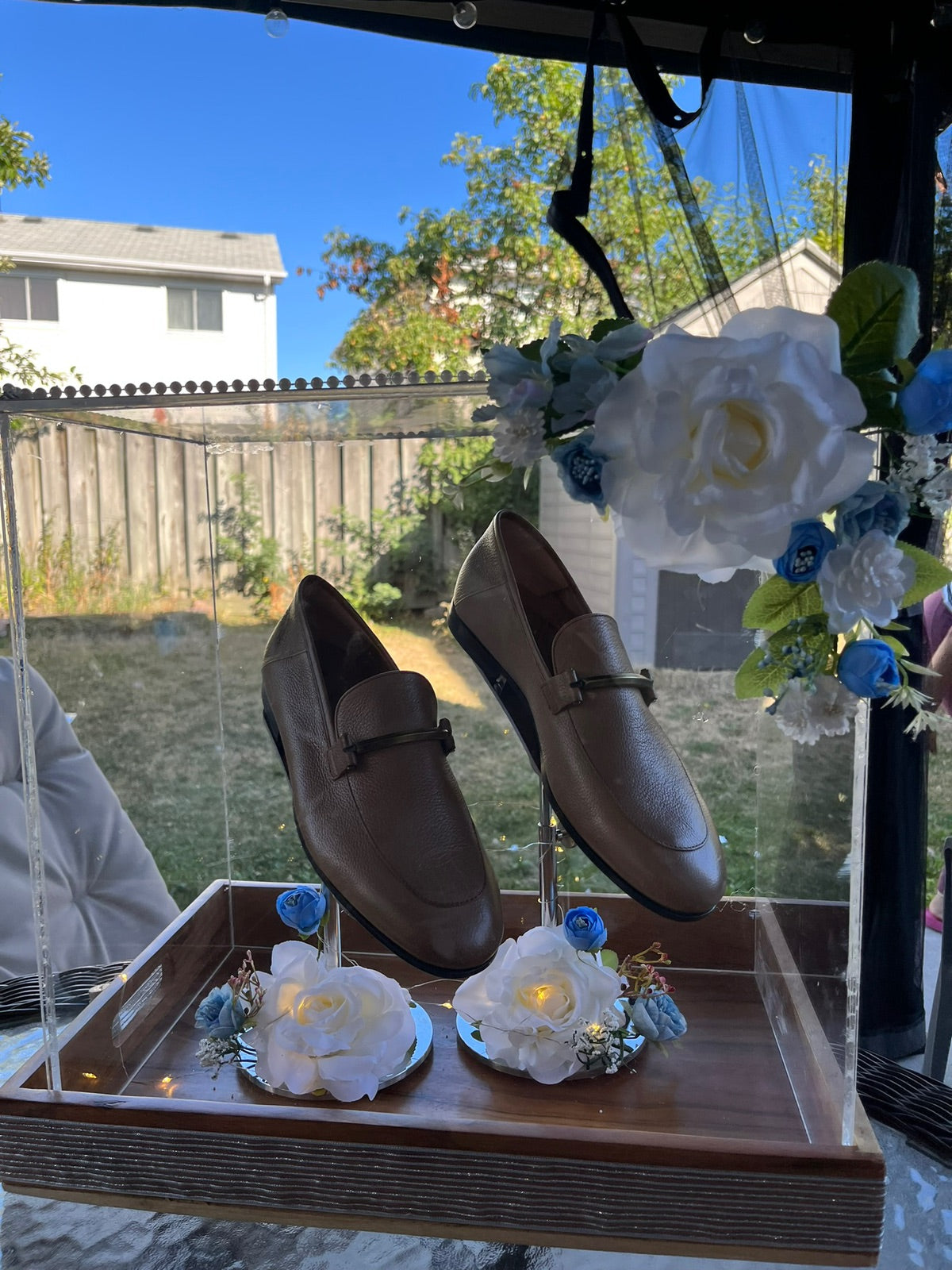 The Box tray includes a customized acrylic box with a setup. You can add shoes or accessories in the platter. Floral setup of your choice.