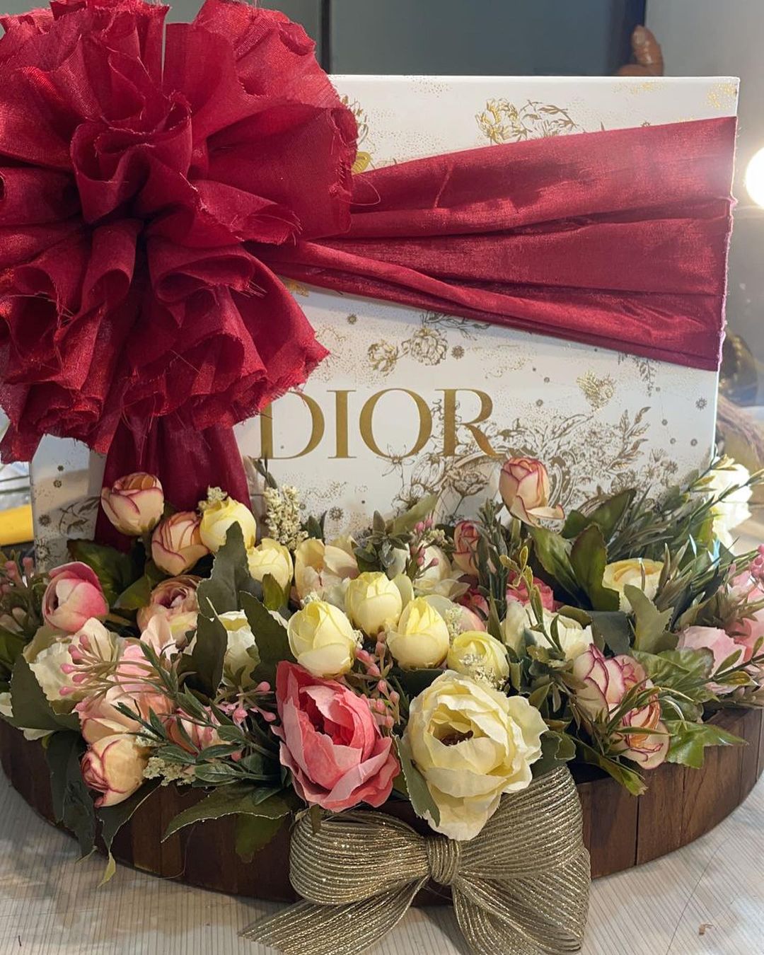 It includes a round tray with grass and floral decor of your choice